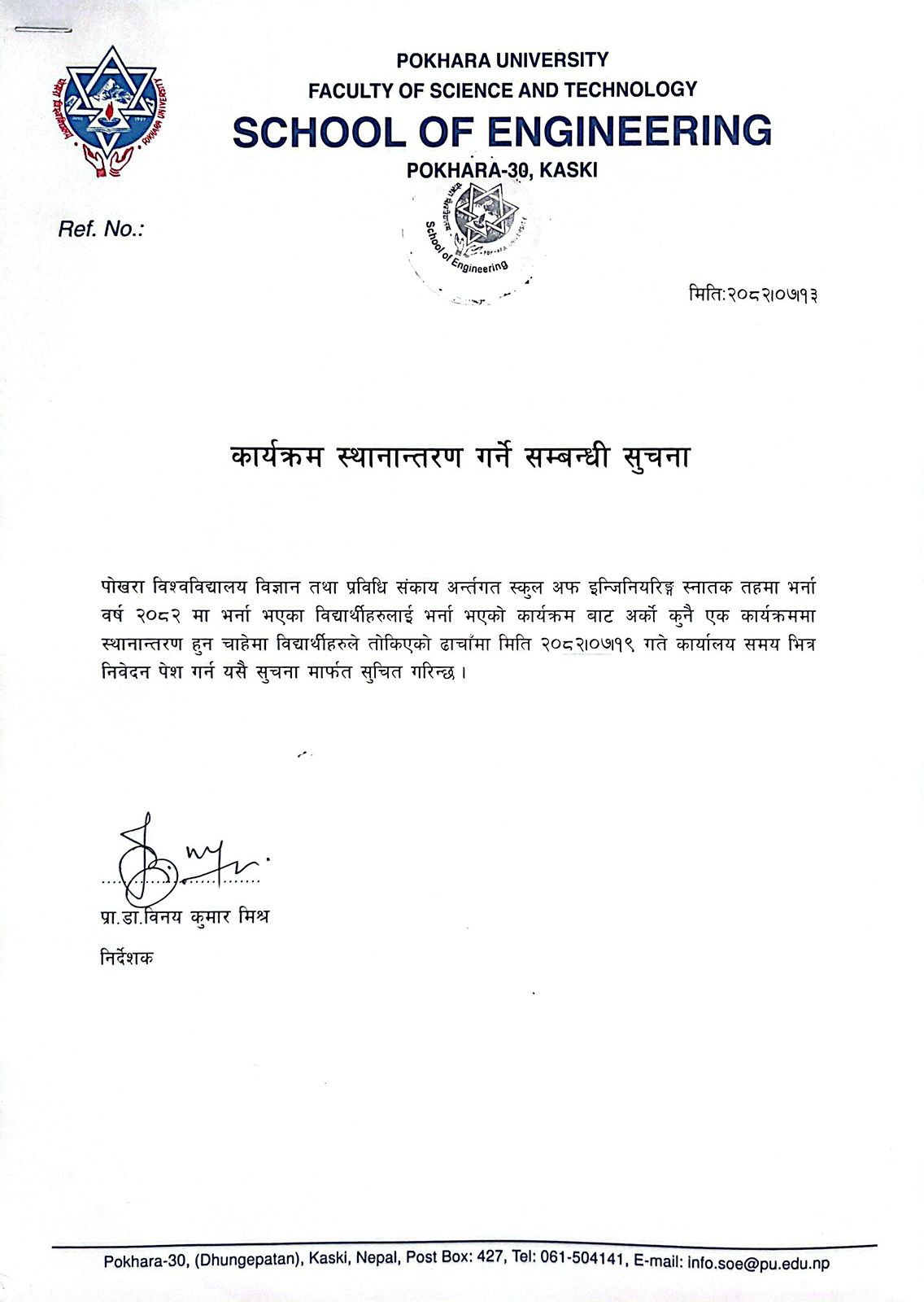 कार्यक्रम स्थान्तरण गर्ने सम्बन्धी सूचना :स्कूल अफ इन्जिनियरिङ !